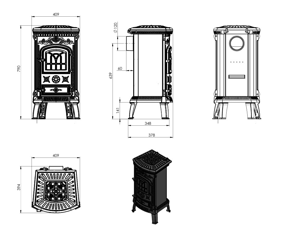 Piec wykonany jest z wysokiej jakości żeliwa pokrytej patyną. Żeliwo cechuje się wysoka trwałością oraz współczynnikiem przekazywania ciepła, dlatego piecyk posiada bardzo wysoką wydajność energetyczną. Kompaktowe wymiary sprawiają, że pasuje do każdego wnętrza.